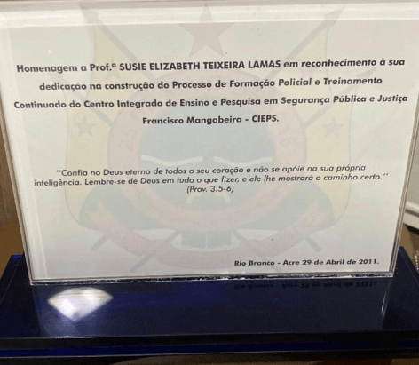 Reconhecimento do Centro Integrado de Ensino e Pesquisa em Segurança Pública e Justiça Criminal Francisco Mangabeira (CIEPS/SESP AC), pela contibuição no Processo de Formação Policial e Treinamentos.