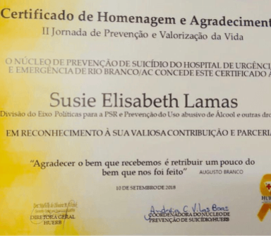 Reconhecimento realizado pelo Núcleo de Prevenção de Suicídio do Hospital de Urgência e Emergência de Rio Branco/AC.