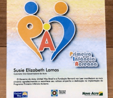 Agradecimento e Reconhecimento do Governo do Estado do Acre, United Way Brasil e Fundação Bernard van Leer pela implantação do Programa Primeira Infância Acreana.